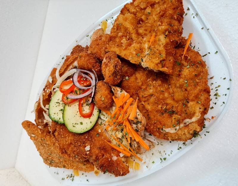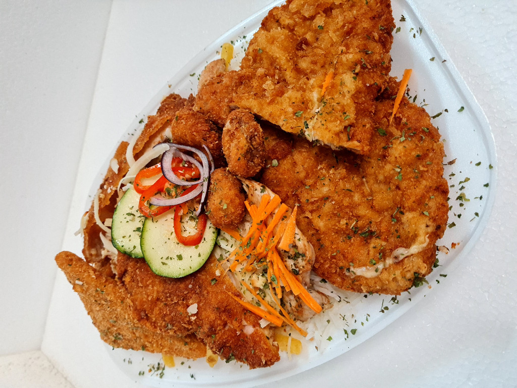 Cordon bleu, Hasábburgonya, Jázminrizs, Natúr csirke, Rántott gomba, Rántott sajt, Rántott sertésborda