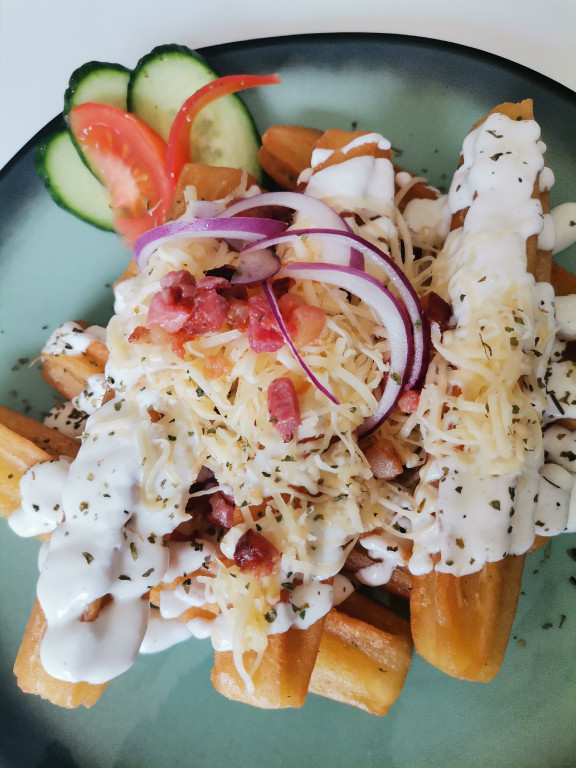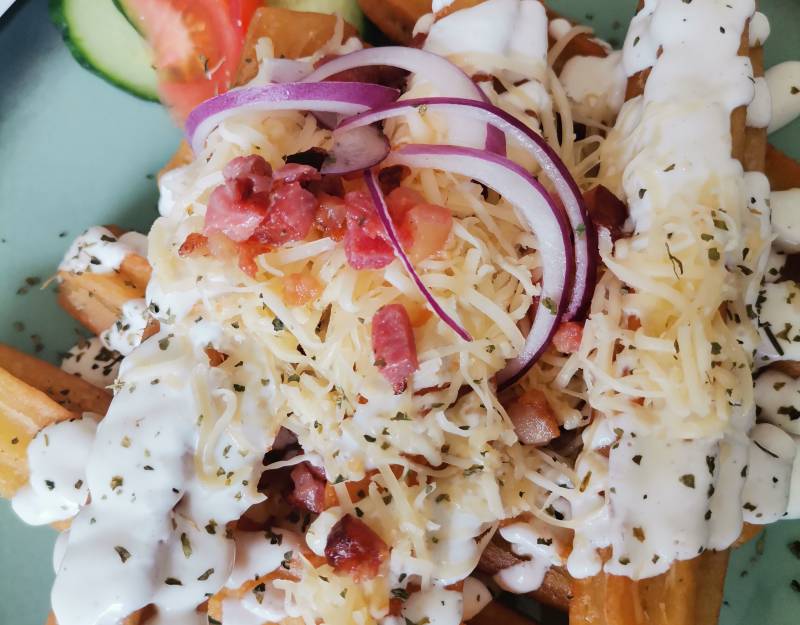 Churros, Fokhagymás tejföl, Lilahagyma kocka, Reszelt sajt