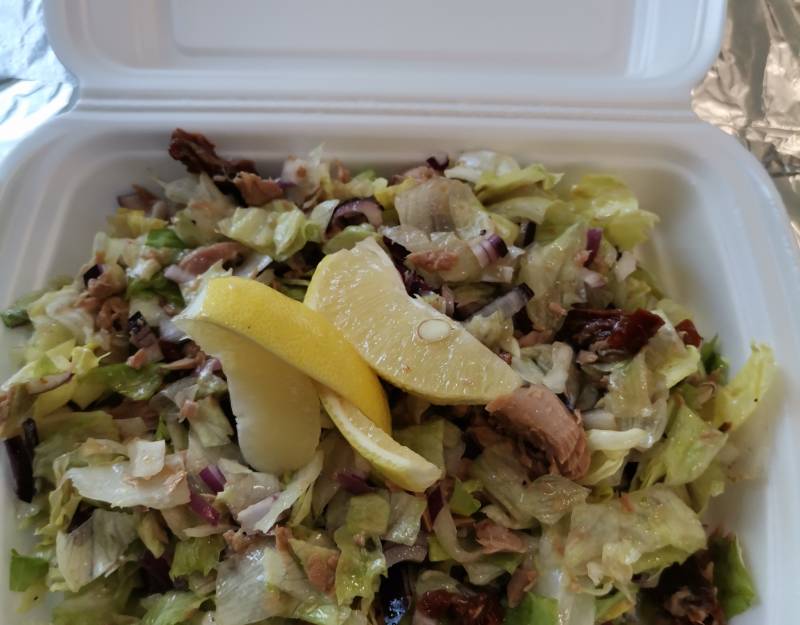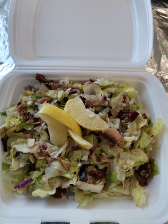 Jégsaláta, Kígyóuborka, Lilahagyma, Olivás dressing, Paradicsom