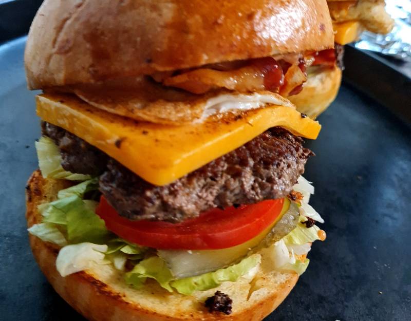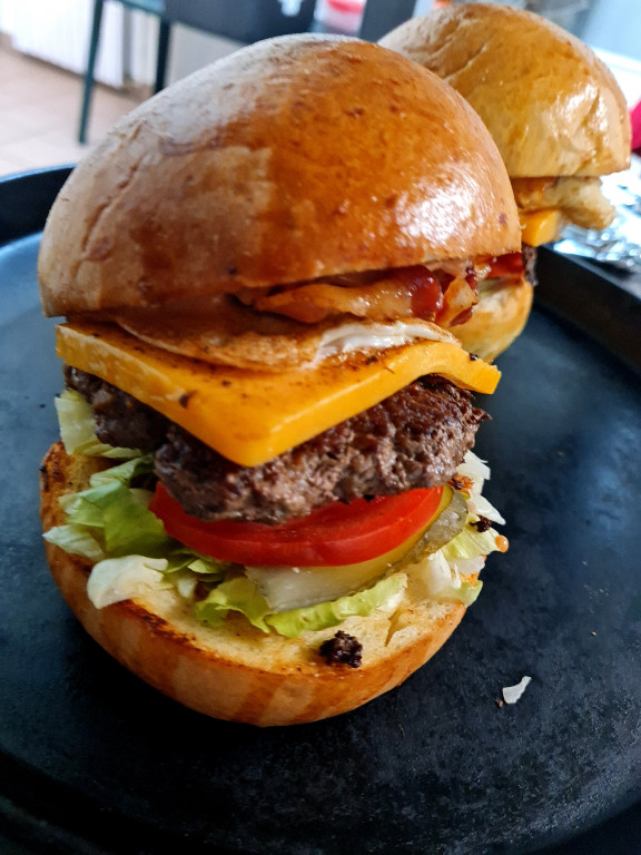 Bacon, Cheddar sajt, Csemege uborka, Hamburger szósz, Húspogácsa, Kézműves zsömle, Paradicsom karika, Saláta, Tükör tojás