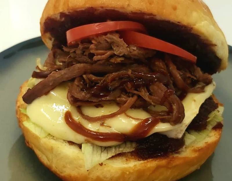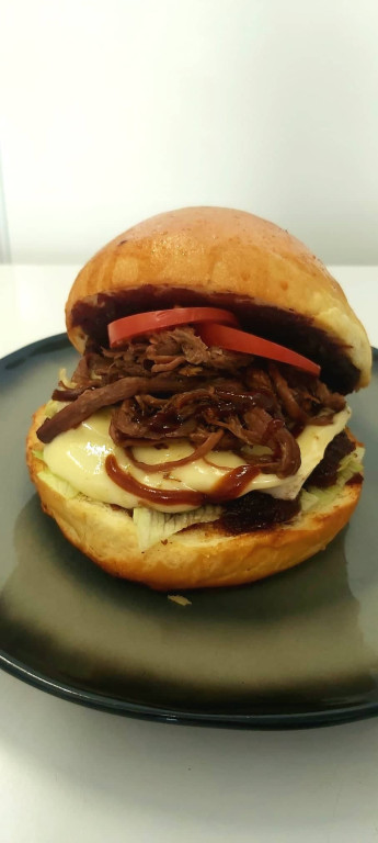 Bbq szósz, Grillsajt, Kézműves zsömle, Lilahagyma lekvár, Paradicsom karika, Saláta, Tépett marhahús