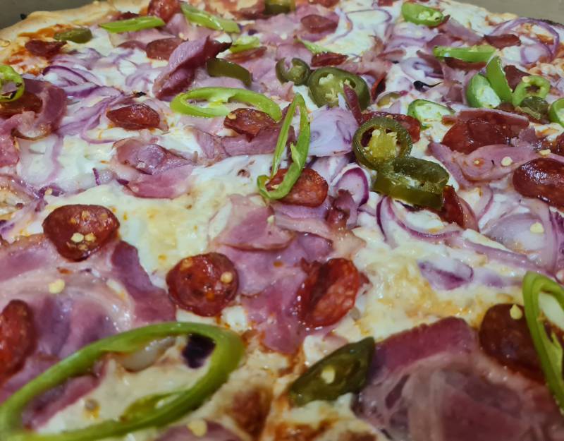 mozzarella, alap:paradicsomos, Hagyma, Hegyes erős, Kolbász, Tarja